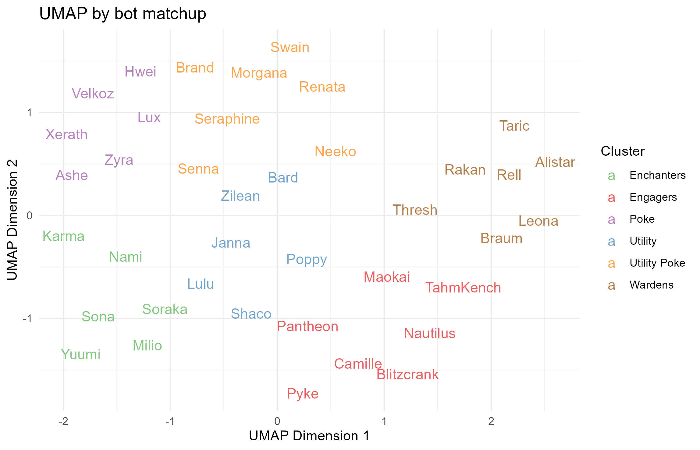 We will employ a UMAP (Uniform Manifold yada yada big words). In simplified terms, a UMAP here will group champions with more similar match-ups together.