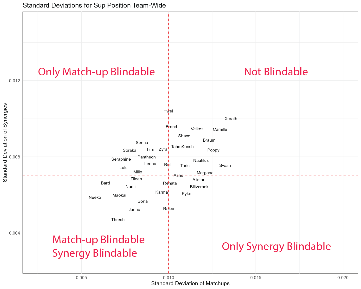 Here we have the Method of Moments corrected standard deviation of match-ups on the x-axis and synergies on the y-axis. I have arbitrarily drawn some quadrants and labeled what they indicate. Let’s look at some extremes. Thresh is blindable in match-up and synergy. His kit is flexible enough to be useful vs any team and with any team. Xerath is the opposite. Xerath is a specialist support that only works with heavy poke and vs non-engage.
